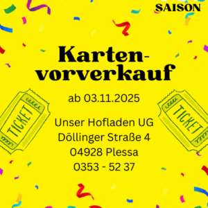 Der Erwerb von Eintrittskarten im Vorverkauf ist ab 03.11.2025 bei Unser Hofladen UG in der Döllinger Straße 4 in 04928 Plessa möglich. Restkarten sind an der Abendkasse erhältlich.
