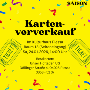 Der Erwerb von Eintrittskarten im Vorverkauf ist am 24.01.2026 um 14Uhr in Raum 13 des Kulturhauses Plessa (Seiteneingang) möglich oder ab dem 26.01.2026 bei Unser Hofladen UG in der Döllinger Straße 4 in 04928 Plessa. Restkarten sind an der Abendkasse erhältlich.