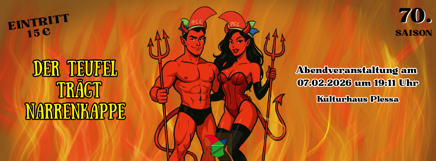 Abendveranstaltung mit Bühnenprogramm und anschließender Disco in der 70. Karnevalssaison des Plessaer Carnevals-Club e.V. unter dem Abendmotto „Der Teufel trägt Narrenkappe“. Die 70. Karnevalssaison findet unter dem Motto „70 Sünden und noch mehr – der PCC tanzt kreuz und quer“ statt.