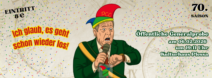 Öffentliche Generalprobe des Bühnenprogramms in der 69. Karnevalssaison des Plessaer Carnevals-Club e.V. unter dem Abendmotto „Ich glaub es geht schon wieder los!“. Die 70. Karnevalssaison findet unter dem Motto „70 Sünden und noch mehr – der PCC tanzt kreuz und quer“ statt.