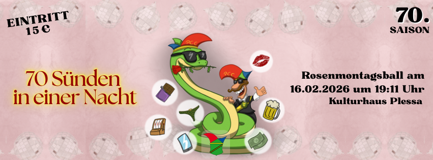 Rosenmontagsball mit Bühnenprogramm und anschließender Disco in der 70. Karnevalssaison des Plessaer Carnevals-Club e.V. unter dem Abendmotto „70 Sünden in einer Nacht“. Die 70. Karnevalssaison findet unter dem Motto „70 Sünden und noch mehr – der PCC tanzt kreuz und quer“ statt.